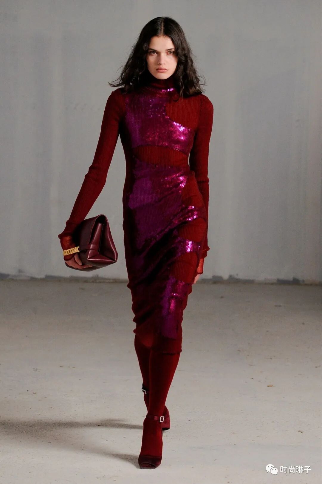 紧身连衣裙是对贝嫂品牌DNA的强烈重申,亮片或幻化印花裙包裹着身体,打造出性感的女性轮廓。