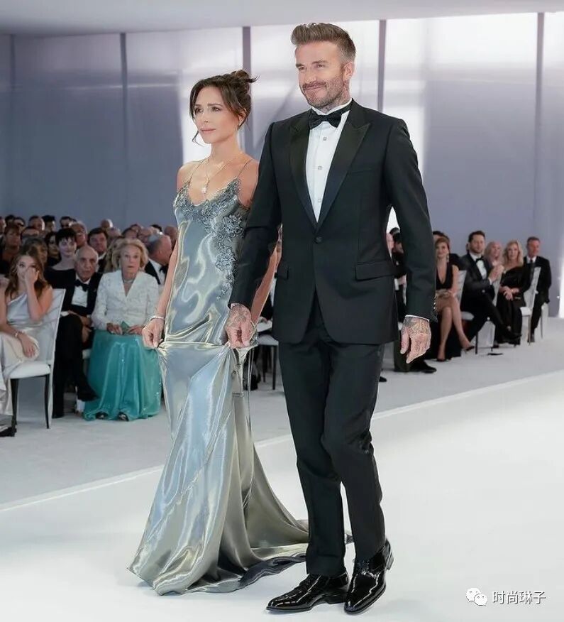 升级为婆婆的贝嫂当天身穿一件银色吊带缎面礼服裙现身,该造型来自她于2008年创立的个人同名时尚品牌。