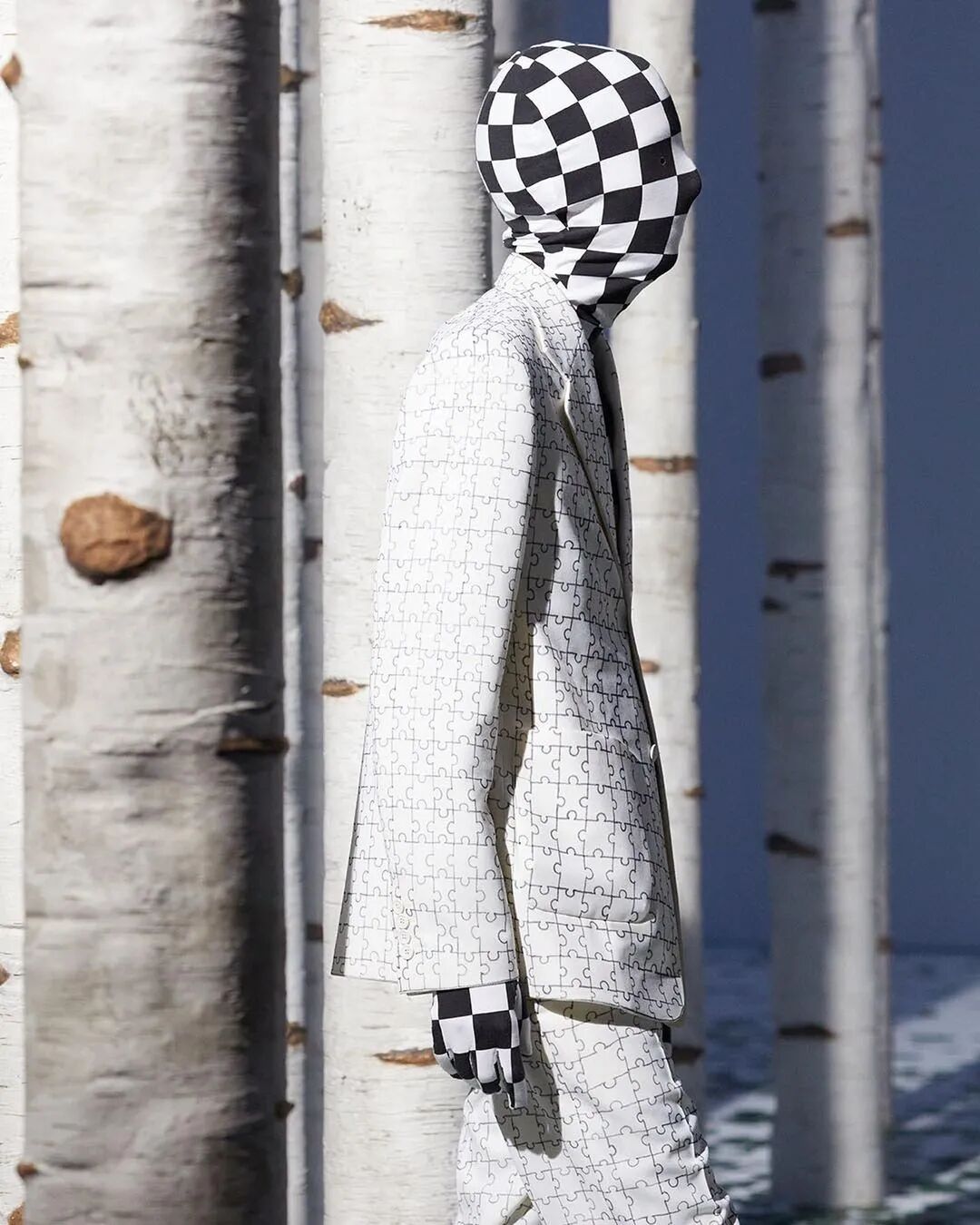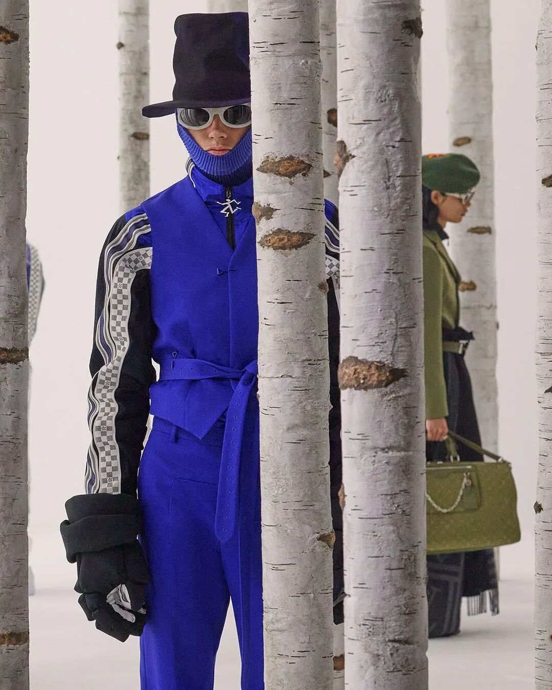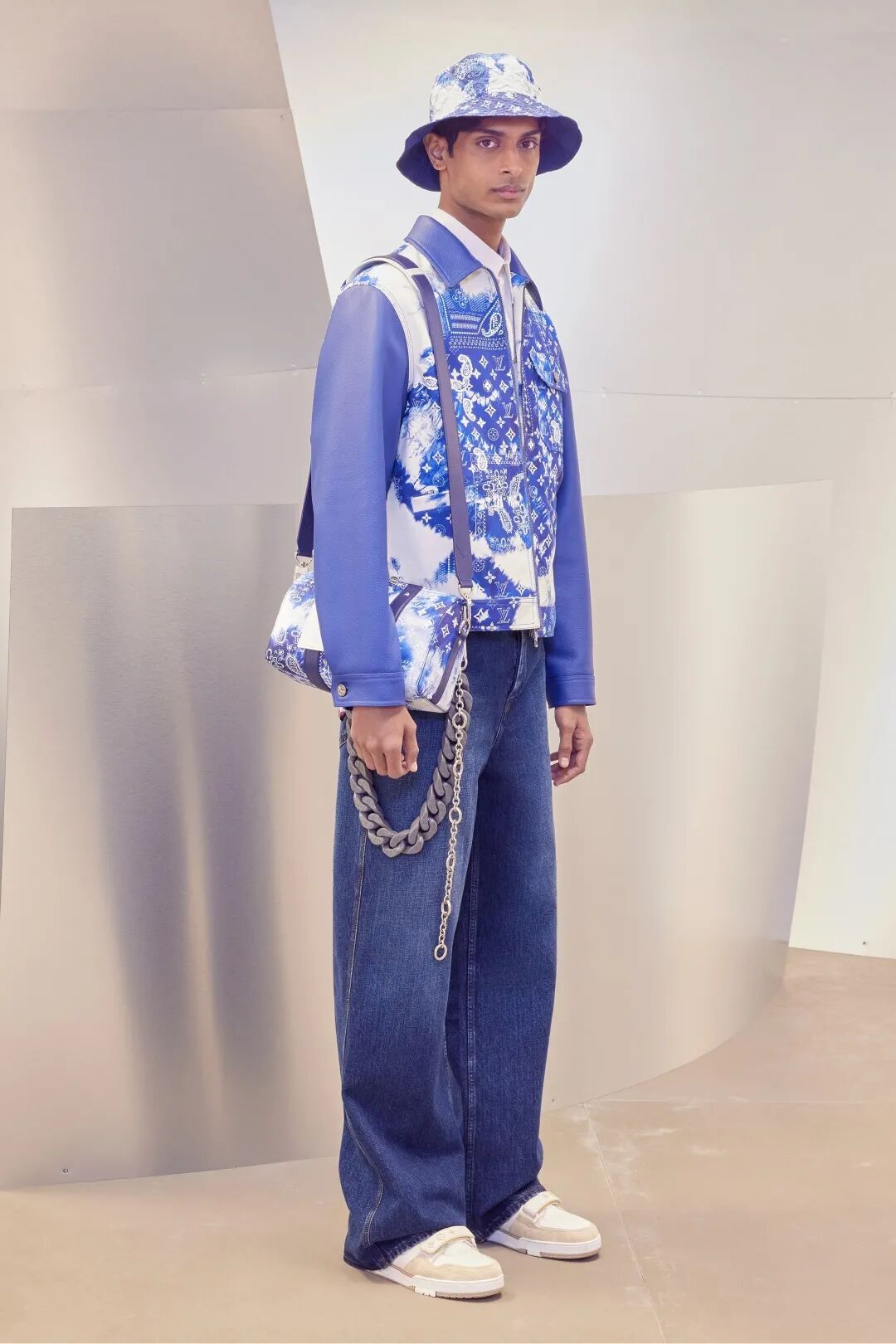字母组合的衬衫、绗缝效果与DIY漂白的工艺都为Virgil Alboh的设计增加了趣味。Damier格子工作服、针刺着山脉的牛仔裤、戴着面纱的养蜂人的帽子相互搭配更是将趣味推至高潮。