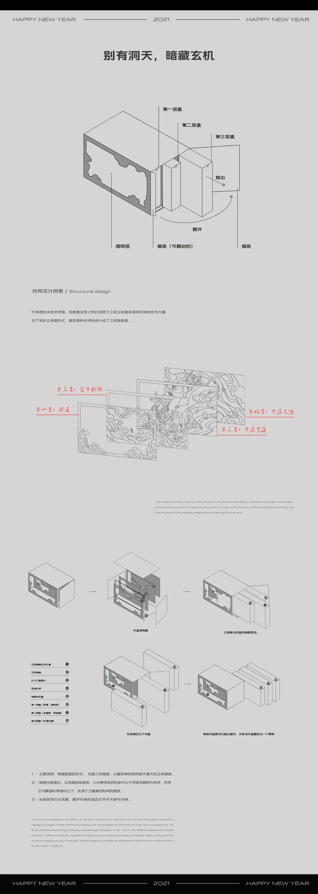 设计上,包装选择三层立体画的形式来展现牛奔跑的冲击感和力量感,盒型也特别设计成三层抽屉盒,随着内盒的抽出,立体画中的三头神态各异的金牛,以不同姿态朝前方奔来,在祥云与飘逸彩带的映衬下,充满了年的喜悦。