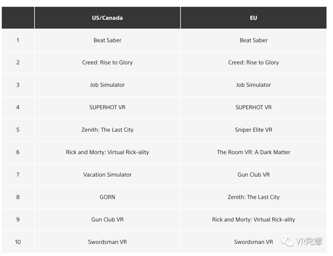 排行榜中,《Beat Saber》、《Creed: Rise to Glory》、《Job Simulator》和《Superhot VR》分别占据了前4名。而《Zenith》在美国排名第5,在欧盟排名第8。