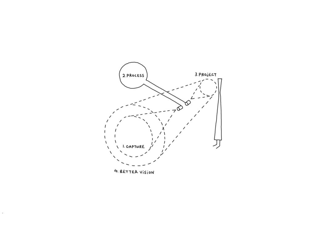 放置在框架中央的相机镜头捕捉图像,这些图像经过高速处理以将亮度和对比度提高到夜盲症佩戴者容易看到的水平。然后将图像投影到佩戴者面前的半透明镜面显示器上。佩戴者还可以在黑白视觉、黑白颠倒和高对比度颜色之间切换,以满足他们的视觉需求。一种模式将亮度增加到预先确定的水平,另一种模式会按段自动调整图像,以用于水族馆或观看电影院屏幕时使用。相机拍摄的图像可以通过蓝牙发送到智能手机,让佩戴者可以远程导航方向,获得其他难以阅读的标志的帮助,并照看孩子。
