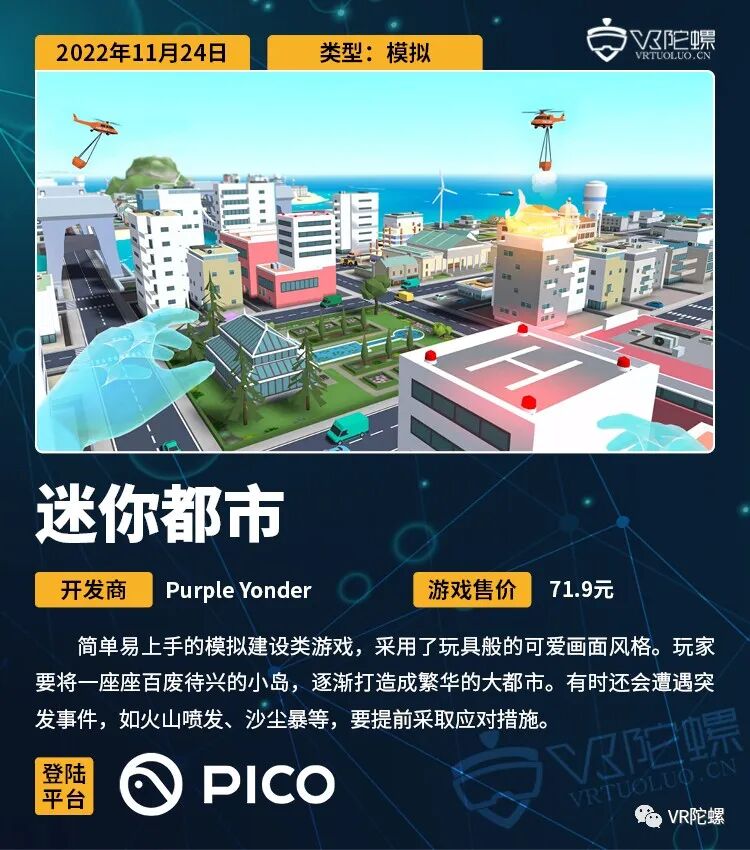 新游方面,上线了一大波射击品类的游戏,不过没有特别出彩的。个人本周最推荐的是PICO引进的《迷你都市》(Little Cities),其画面风格清新,上手容易,很适合对模拟建设题材游戏感兴趣的轻度玩家。