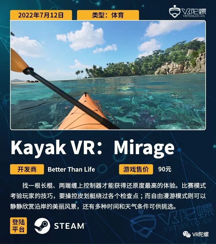 本周的新作数量众多,Steam还有7款VR游戏的免费试玩版上线。模拟皮划艇运动的《Kayak VR: Mirage》在其中热度最高且获得了“特别好评”,玩家们纷纷对游戏里优美的风景表示赞扬。不过除了VR设备外,还得找一根长度适中的棍子把控制器固定在两端,才能获得更真实的体验,另外还需注意游玩时周围的空间情况。