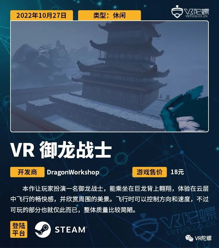 本次周报统计10月22日~10月28日期间上线的VR游戏,共计26款,后文按照发售时间排序。截至2022年10月28日,各主要VR平台的内容数量如下: