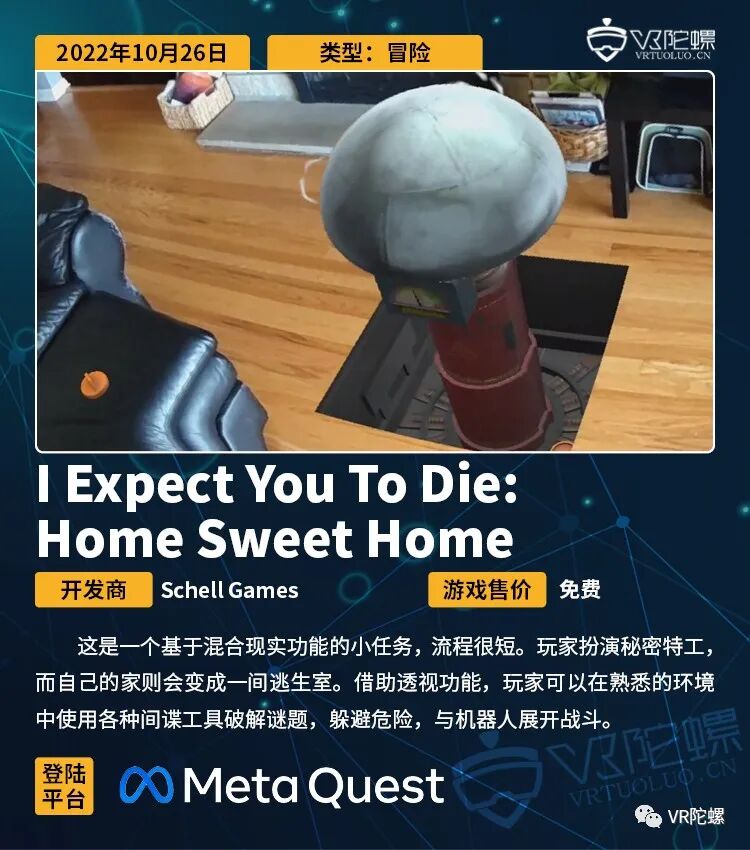 《I Expect You To Die》是VR玩家非常熟悉的系列,这次也为Quest Pro的首发助阵,推出了免费下载的《Home Sweet Home》可供体验。我们无比期待未来有更多的VR游戏能用上这些新技术。