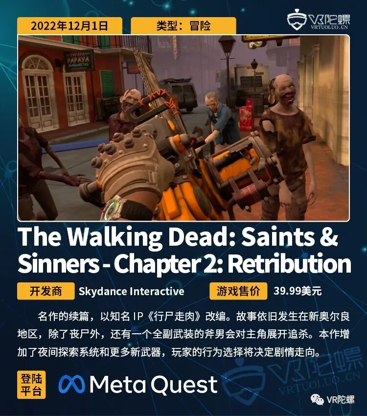 本周最引人注目的焦点新作无疑是《行尸走肉 圣徒与罪人2 惩罚》,1代的累计销量突破100万,续作也终于在Quest平台率先发售,Steam、PSVR、PSVR2和PICO等平台则要等到2023年才能玩上这款大作。