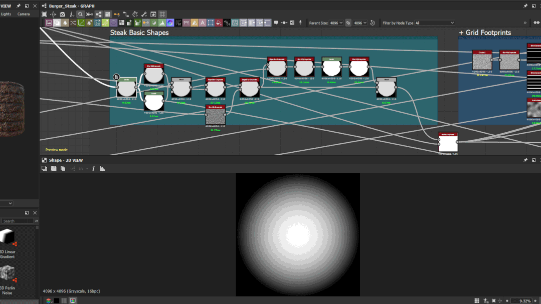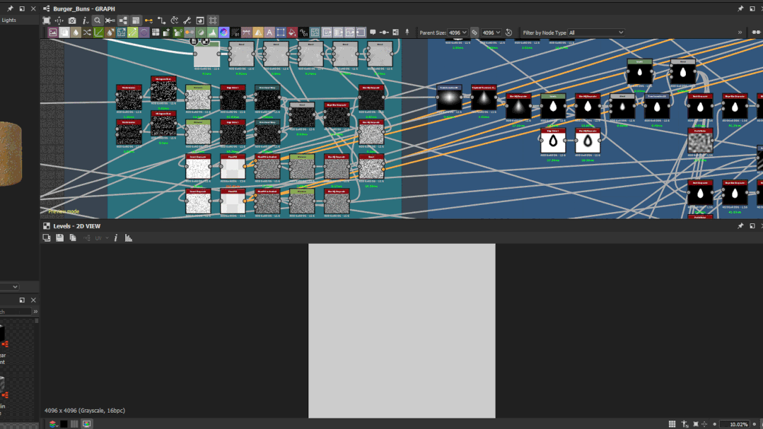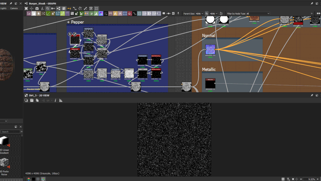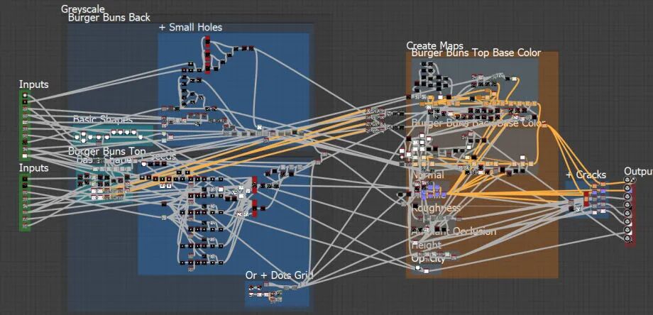 对于 burger 项目,我为每种材料创建了一个新图表,以使其更具可读性并且以后更易于导出。每种材料都可以通过尽可能多的控制进行自定义,目标是将它们导出为 .sbsar,以便在我们的汉堡模型上的 Substance 3D Painter 中使用它们作为基础材料。