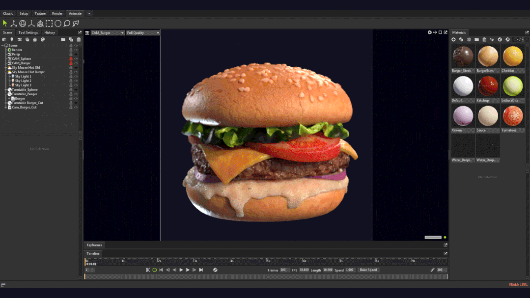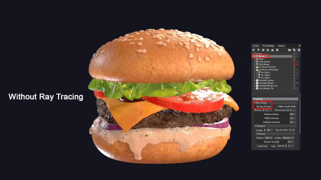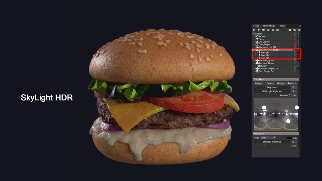 对于这个项目,我为每个材质项目制作了一个场景,例如,如果我需要增加 SubDivisions,我可以通过使场景更轻来避免崩溃问题。我有一个汉堡面包、牛排、西红柿的场景,一个只有汉堡的场景,另一个是汉堡及其装饰的场景。