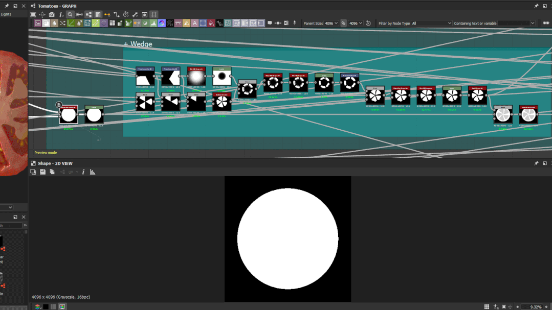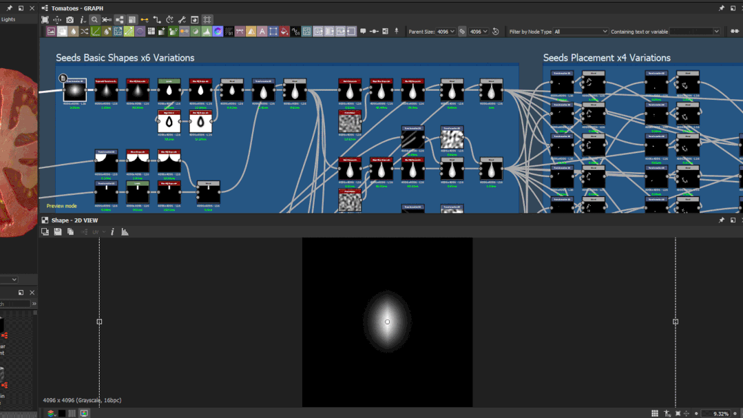 然后我处理番茄的内凹部分。我使用由相同参数控制的相同 Splatter Circular 将元素从 3 更改为 6。我还使用种子蒙版创建从番茄中心开始的种子根。我添加了更多的斜率模糊灰度以使番茄的形状更加有机,并添加模糊作为中央部分的渐变。