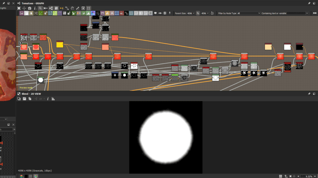 我现在使用 Gaussian Spots 2,Grunge Map 007 为番茄添加一层细节,该图层与番茄一起进入 Non Uniform Directional Warp。我添加了一些小点和我们在上面看到的圆形种子蒙版,以在种子位置创建凹坑和凸起。