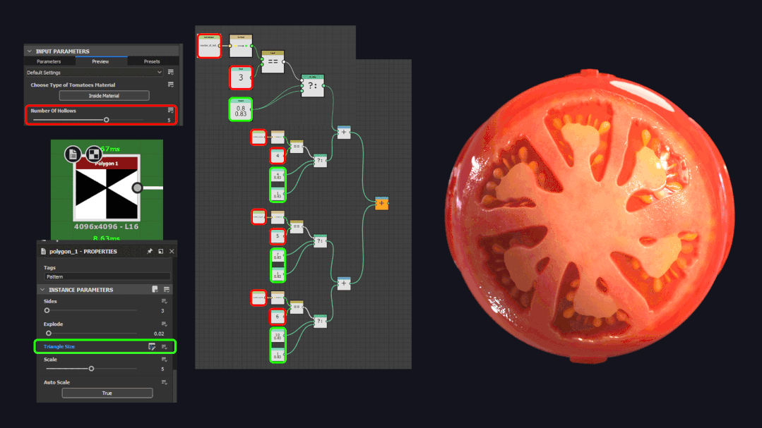 我们从 Disc 模式中的 Shape 节点开始,用于基本形状。为了创建将容纳番茄种子的碎片,我使用具有 3 个边的 Polygon 1 节点,在其中我改变三角形大小以根据我想要的碎片数量使用 if/else 函数创建碎片的形状,这里我想要 3 到 6 瓣。