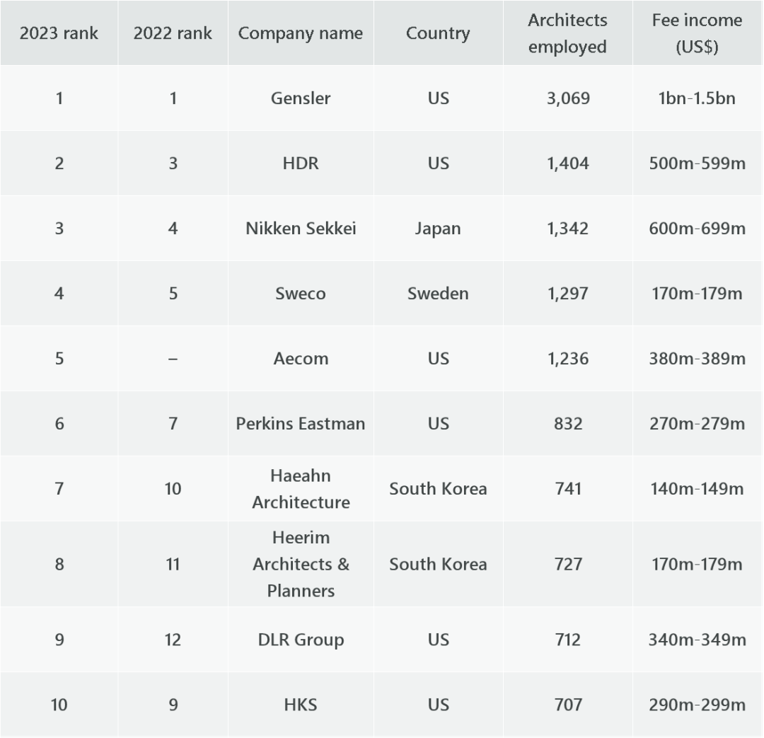 位列第一的依旧是美国的 Gensler(3,069名建筑设计师);第二名至第十名依次为美国 HDR、日本日建设计 Nikken Sekkei、瑞典 Sweco、美国 Aecom、美国 Perkins Eastman、韩国 Haeahn Architecture、韩国 Heerim Architects & Planners、美国 DLR Group 和美国 HKS。