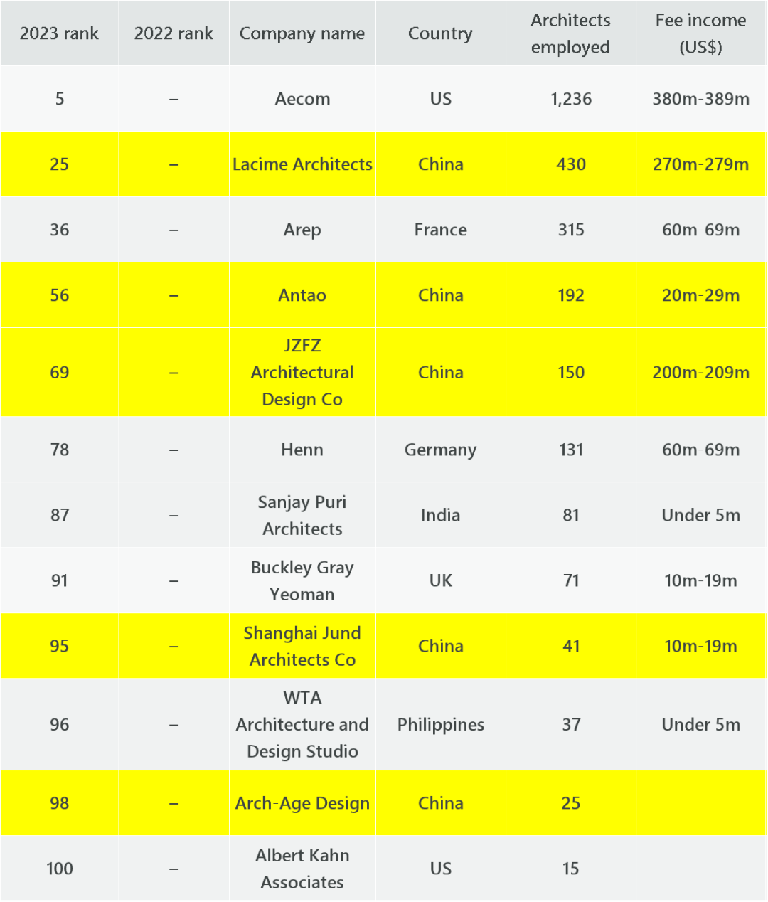 此次上榜的中国公司分别为:第十二名凯达环球 Aedas、第十六名天华建筑设计公司、第二十五名日清设计、第二十九名梁黄顾建筑设计、第三十五名刘荣广伍振民建筑师事务所、第四十三名10 Design、第四十五名王董集团、第四十六名巴马丹拿集团、第四十七名吕元祥建筑师事务所、第五十三名 Lead8、第五十六名 antao安道设计、第五十九名利安顾问有限公司、第六十九名基准方中建筑设计股份有限公司、第九十五名上海骏地建筑设计事务所股份有限公司、第九十八名AAD长厦安基。
