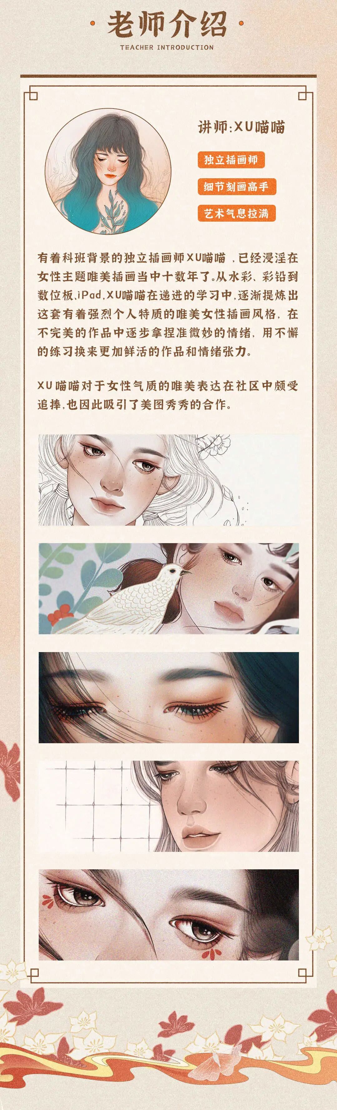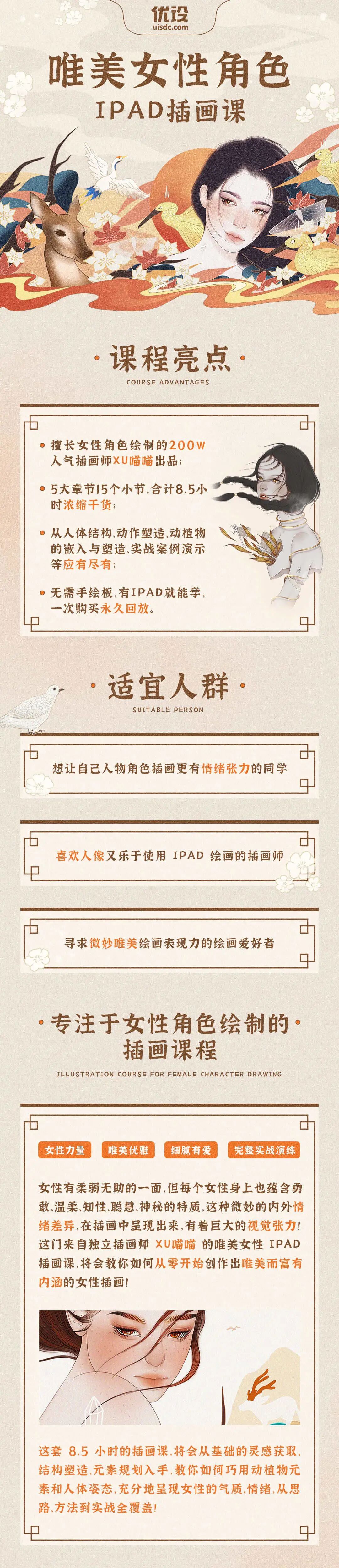 最新文章2024-02-14 挖到一个宝藏插画师!!!! 挖到宝了。 在刚刚看到独立插画师Xu喵喵的画作的时候,脑子下意识跳出了《离骚》中描写「香草美人」的浪漫词句: 制芰荷以为衣兮, 集芙蓉以为裳。 不吾知其亦已兮, 苟余情其信芳。 —屈原《离骚》 Xu喵喵确实几乎只绘制女性角色,但是她笔下的角色气质、意象、表达手法绝对不单调,比我最初想象中要丰富太多: 这些女性角色,或烂熳,或优雅,或俏皮,或哀伤,或娴静,或可爱: 花草藤蔓替代了华服,飞羽流云里蔓延着情绪和想象: 如果你也想想学习独立插画师 Xu喵喵 的创作方法,在演示过程中一窥她绘画的秘诀,不要错过今天的课程: 这门录播课程时长约8.5小时 课程原价 129 元,上新特惠价 89 元! 之后立刻恢复原价!难得好课,不要错过~ 用「花鸟风月」来刻画女性形象的插画师 也许已经不用我用太多的语言来描述,你已经感知到 Xu喵喵 用植物和动物来表达女性特征的「笔力」了。和很多画师不同,Xu喵喵 的作品当中融合了传统绘画的「意象」,又从现代艺术创作中汲取「想象力」的艺术手法,将「女性角色」这一选题之下,延伸出千变万化的创作。 仅仅只是一台 iPad 一支笔,她就能让你看到到层峦叠嶂般的丰富作品。 那么,她又会在这套课程中怎样教会你,她的创作方法呢?往下看。 唯美意境,始于构思,成于刻画 和很多插画课程一样,Xu喵喵的这套插画课是从她的个人创作经历和风格成型入手的,不过她非常注重人体和动植物元素的刻画。 所以在正式开始演示之前,Xu喵喵会相对详细地为你拆开讲解灵感的获取,人物、动植物元素的唯美感塑造的技巧。 课程案例 在一段 iPad Procreate 的软件技巧分析之后,你会跟随着她的画笔,完整地学习上图的绘制过程,从中逐步了解她的绘画技法,从草稿的绘制,到线稿的描摹,元素的处理方式,色彩的附着,到最后完成的全部内容: 这门录播课程时长约8.5小时 课程原价 129 元,上新特惠价 89 元! 之后立刻恢复原价!难得好课,不要错过~ 下面是更多 Xu喵喵 的插画作品: 这门录播课程时长约8.5小时 课程原价 129 元,上新特惠价 89 元! 之后立刻恢复原价!难得好课,不要错过~ 本文来自微信公众号“优秀网页设计”(ID:youshege)。大作社经授权转载,该文观点仅代表作者本人,大作社平台仅提供信息存储空间服务。 TAGS: XU中喵喵女性课程 相关文章英赫日报 | 李宁 × 空…米兰时装周的异星来客,用结…米兰“MoLo”移动与物流…西班牙艺术家 Juan d…把小鸟画成美少女,她弃医从…这些鸡蛋包装不只是有趣,设…国产文具又炸了!晨光再造“…七点资讯 |《更衣人偶坠入…AlphaDraw筑绘通「…秦始皇的黑,是你不懂的黑。