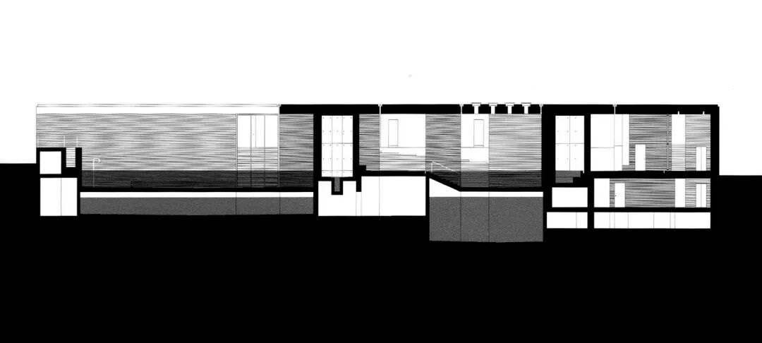 由混凝土结构支撑的配平面和突出的天花板元素放在一起,彼此之间的距离很近,形成一个几何图案,有缝隙让光线从上方进入,这些部分都强调了构图的独立性原则。看起来像石桌,层压的数量由石板的覆层决定,其中每个部分都经过精心测量:“从建筑上看,石头的简单层压产生了几乎字面意义上的整体印象”。