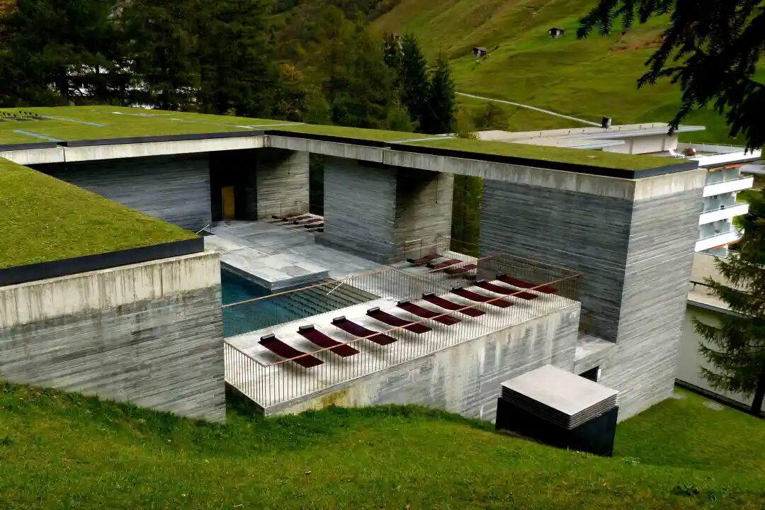 新的温泉浴场独树一帜,一半沉入地下,它与现有的酒店大楼分离,仅通过地下通道与之相连。整体的石头结构给人的印象是房间以迷宫般的方式存在。建筑师声明:它是“一种放弃正式融入现有建筑的建筑,提出在我们看来与手头任务相关的更基本的东西:即放置新的温泉浴场与山景、地质物质以及地形起伏之间特殊的关系”。