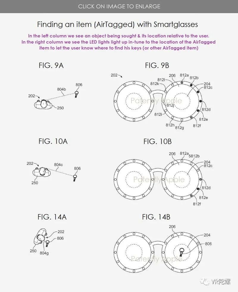 在接下来的一系列专利图中,苹果公司说明了围绕眼镜内框的LED形式的三级显示如何用作一个指示系统。在下面的例子中,用户正在寻找他的钥匙。LED显示屏将点亮部分灯光,指示他的钥匙可能被找到的方向。这只有在钥匙连接到AirTags设备上时才能发挥作用。虽然该专利没有说明这一点,但智能眼镜没有其他办法知道在哪里可以找到丢失的物品。