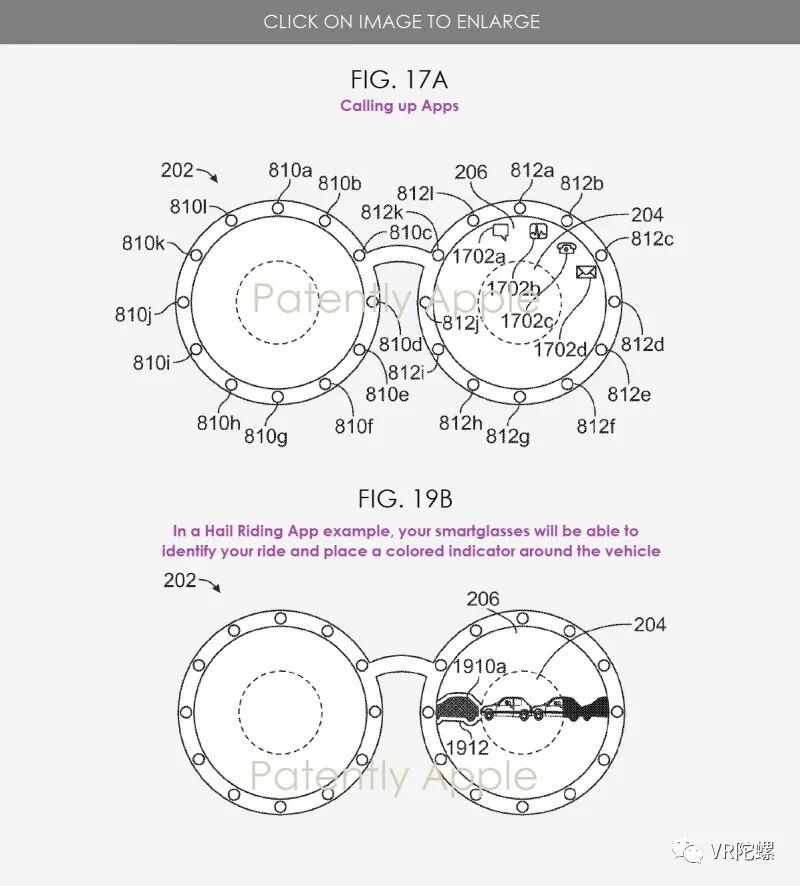 在专利图19B中,我们可以看到眼镜显示了一辆周围有轮廓的车辆。该轮廓将向用户指出哪辆车恰好是他们叫到的Uber车。视觉辅助可以是一辆车的整体轮廓或放大图像,以表明哪辆是用户的车。
