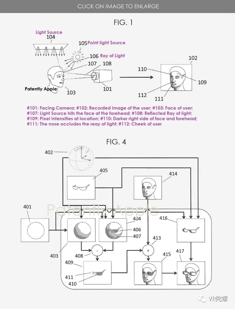 苹果公司的专利图1说明了在图像中捕捉用户面部的方法,以及一般的设置;图4显示了差分渲染的步骤。