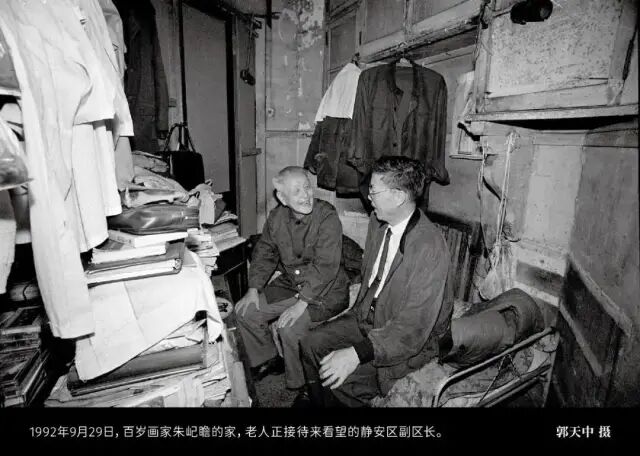 1992年一张老画家朱屺瞻在家中接待静安区副区长的照片让人影响深刻。过去对朱屺瞻的印象多来自于新加坡摄影艺术家蔡斯民在1980年代的拍摄,蔡斯民镜头中的朱屺瞻或画画或摆弄菖蒲总带着一丝世外高人的气息。但此次展览的照片中,朱屺瞻更像是生活在上海老房子中的普通老人,体会着“螺蛳壳里做道场”的入世哲学。