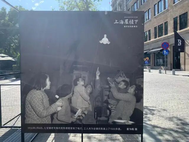 在此,一张“上海屋檐下”的照片吸引不少人停下脚步。照片中的一家人围着一盏点亮的灯,露出稀奇且幸福的笑容。那是“1956年2月8日,七宝镇老宅角农民陈德根家有了电灯,工人共为全镇农民装上了1500多盏”。