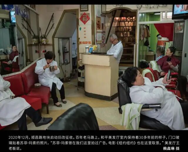 另一张大照片拍摄了顺昌路上的和平美发厅,因为建国东路的旧改,这间营业近80年的理发店已于2021年9月16日正式闭店。和平美发厅美发店之所以特别,是因为它“原汁原味”地保持着30多年前的样子,除了格调和布局外,店里上了年纪的“剃头师傅”也是上个世纪的调调。按“和平美发厅”的图说所写:“门口玻璃是那个贴着苏菲·玛索的照片,‘苏菲·玛索曾在我们这里拍过广告,电影《纽约纽约》也在这里取景。’美发厅王老板说。”