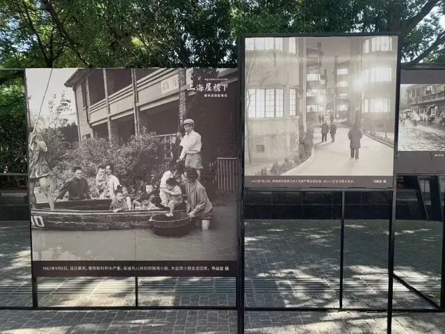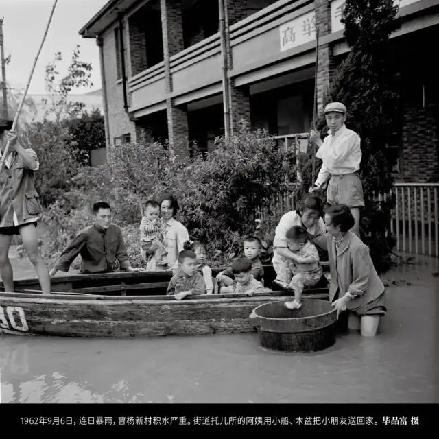 在照片前踱步,1962年初秋,曹杨新村严重积水,托儿所的阿姨用小船、木盆送小朋友回家。照片中阿姨高卷裤管趟在水中,船上的工作人员,撑着长篙待渡。1963年冬日,陕南新村里弄工作人员冒着严寒巡视检查。冬日的寒气弥漫在雾色之中,宽敞的里弄、家中透出亮堂的灯火,让人想到如今的“陕南邨”依旧带着上海上世纪三四十年代独有的考究,淡黄的水泥外墙与红色的壁柱之间浸润着文化的气息。