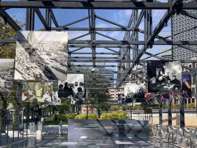 上海苏州河畔“划船俱乐部游泳池旧址”被一个巨大的镜面装置覆盖,其上铺陈着1949年以来解放日报社记者拍摄的有关上海生活的照片。游览、途经或散步至此的市民多会驻足、回忆过往。