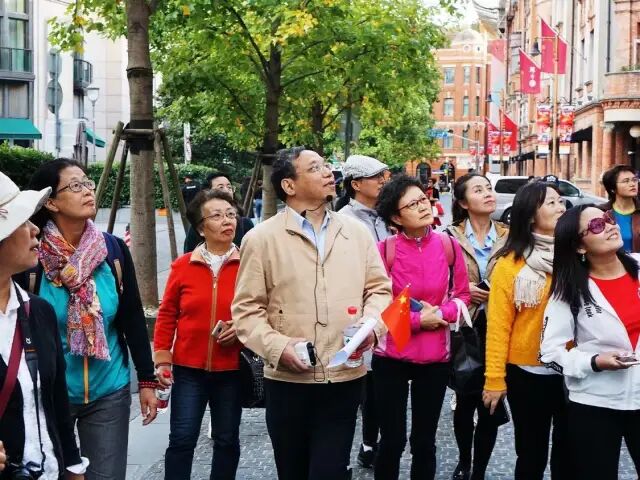 陈远东(中)作为导览员讲述外滩建筑的历史。(受访者供图)