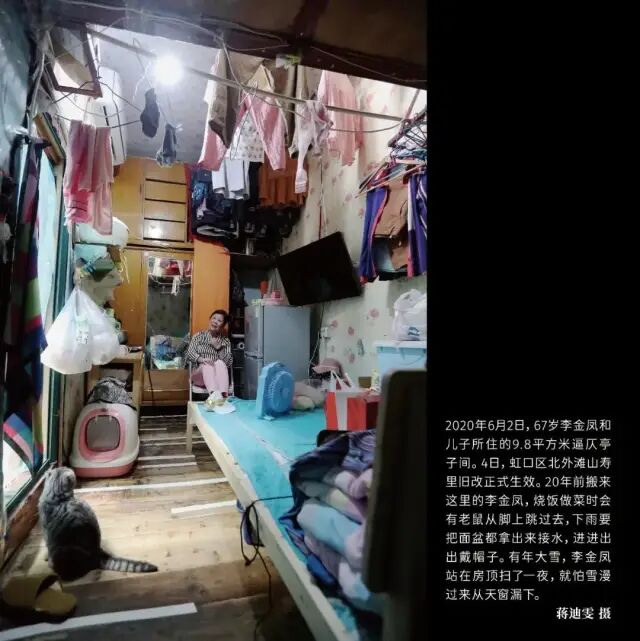 当时间来到2020年,一张摄于虹口区山寿里一个9.8平的亭子间的照片,透着上海人的精致与艰辛。照片中67岁的李金凤与儿子同住在逼仄的亭子间,门边的小猫、天花板上晾着的衣服、家里的陈设讲述她的生活故事。
