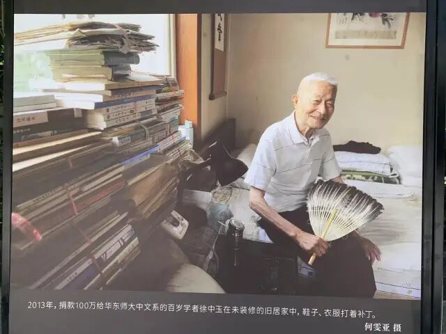 转到背面,2013年,捐款100万给华师大中文系的百岁学者徐中玉的照片让人停驻。照片中的徐中玉先生一头白发、手摇鹅毛扇,和蔼、睿智、精神矍铄,他身边一摞摞叠起的书册、大抵诠释着“著作等身”的含义。除了做学问的书本外,他家中的陈设简朴整洁,甚至透着一股陈旧的痕迹,但就是这样一位先生,捐出百万用于教育。2019年徐中玉先生作古,享年105岁。但照片作为记忆,记录了他的朴素与慷慨。