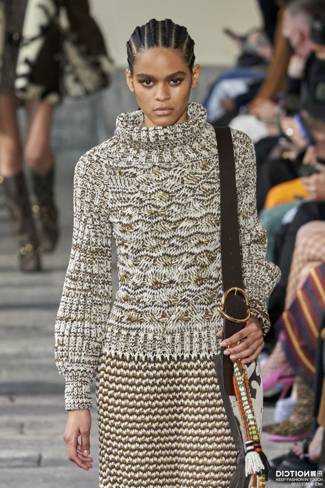 在 Etro 2022秋冬系列中,纹理即图案,图案即纹理。针织连衣裙长款及地的垂坠设计搭配绒面革或印花平底靴。