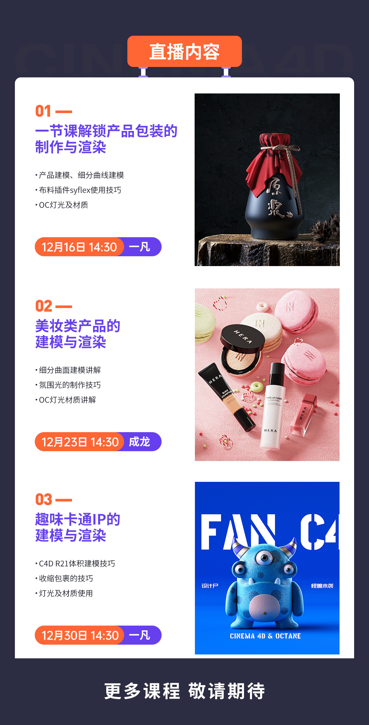 直播课程一共6节,带领想学产品建模、产品包装、活动主题场景搭建、卡通IP和OC渲染器的使用技巧: