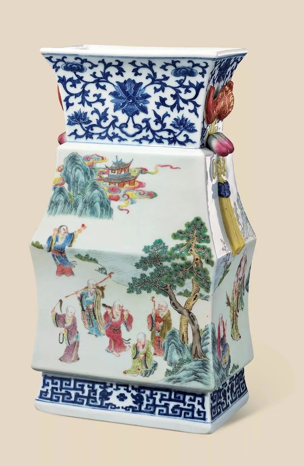 清道光 青花缠枝莲纹粉彩十八罗汉图扁方瓶