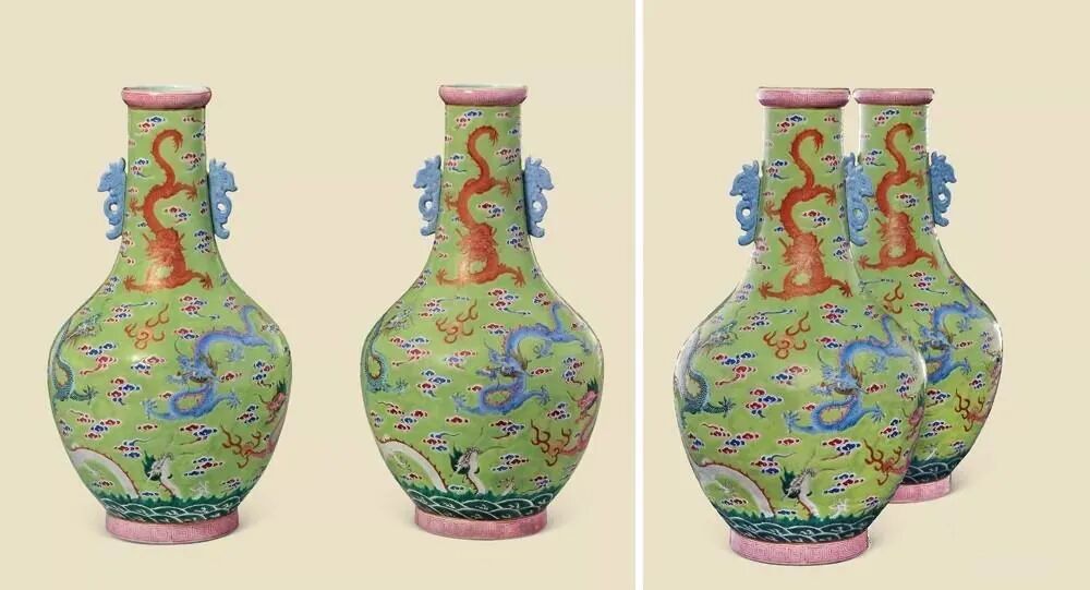 清道光 绿地粉彩云龙纹瓶(一对)