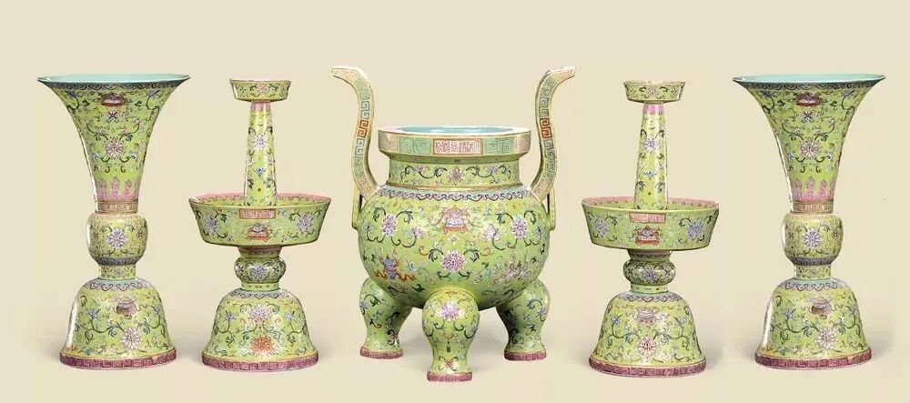 清道光 浅绿地粉彩八宝纹五供(一套)