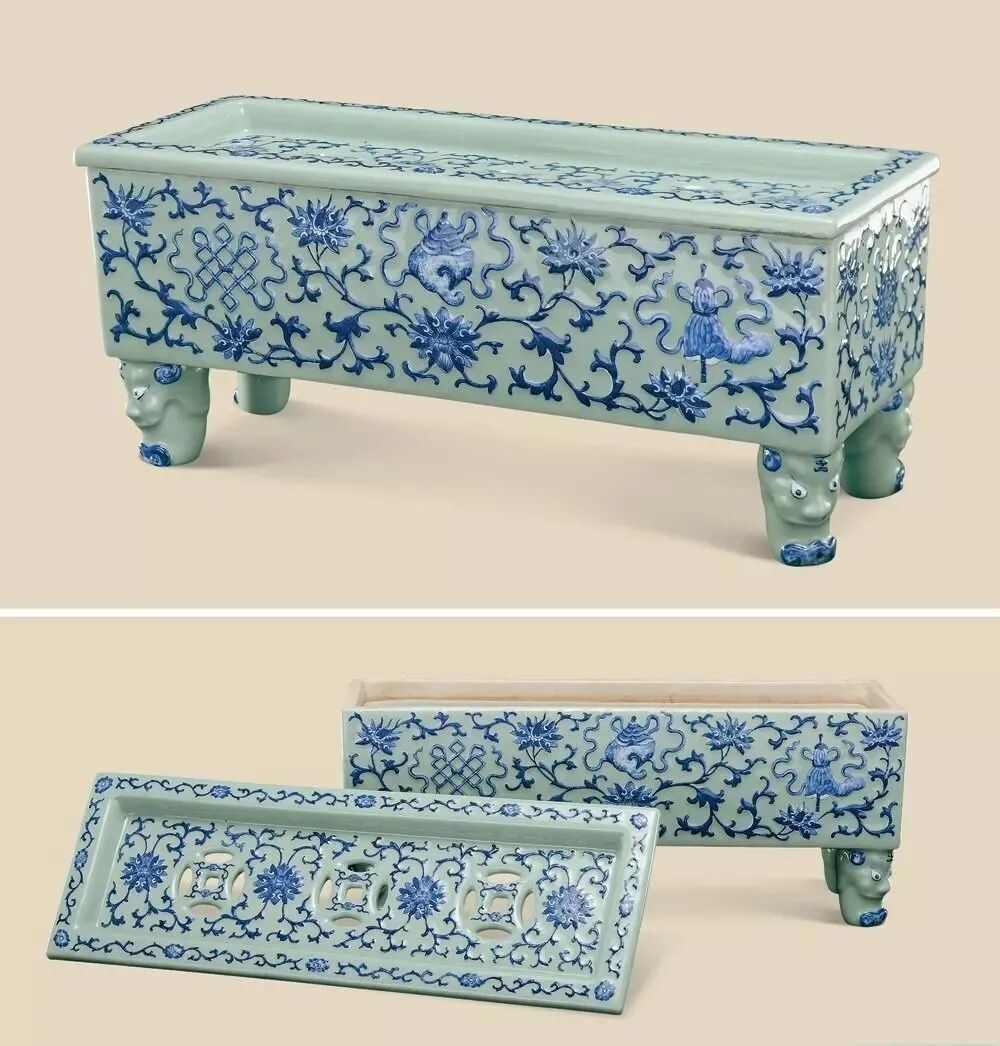清道光 豆青地青花八吉祥兽足香熏