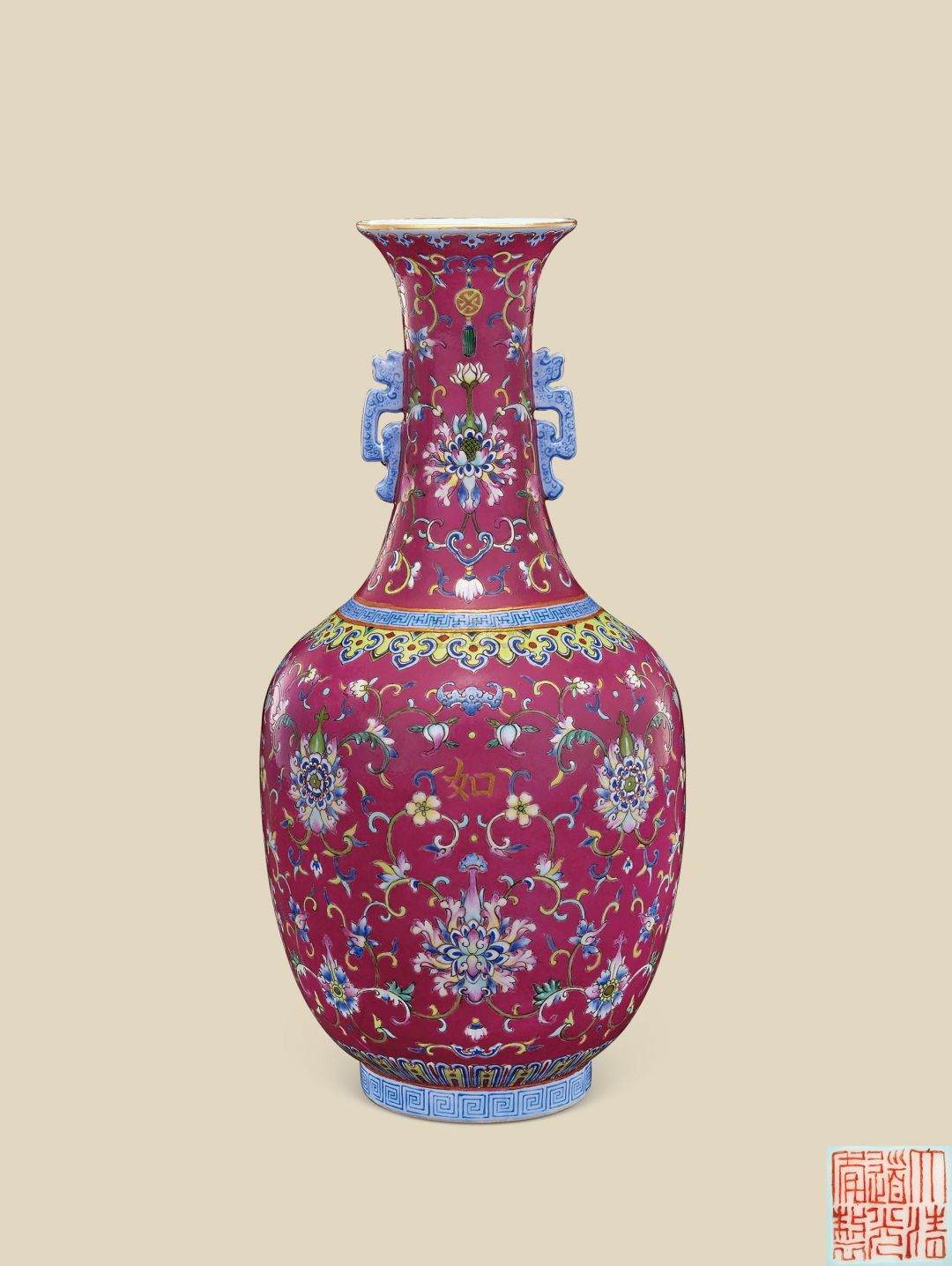 左二 清道光 胭脂紫地粉彩缠枝莲纹“吉祥如意”双耳瓶