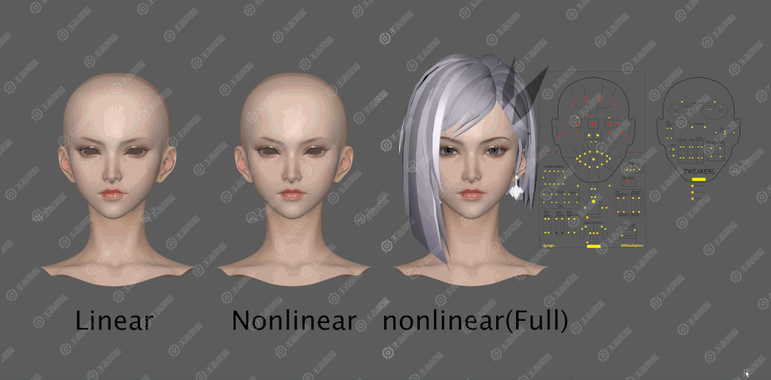 开发的这套绑定系统可以把优化之后的面部控制器直接投射在角色的面部上,使前期美术人员也可以通过简约明确的控制器得到非常直观生动的角色面部表情,再通过与面部捕捉数据进行非线性融合。