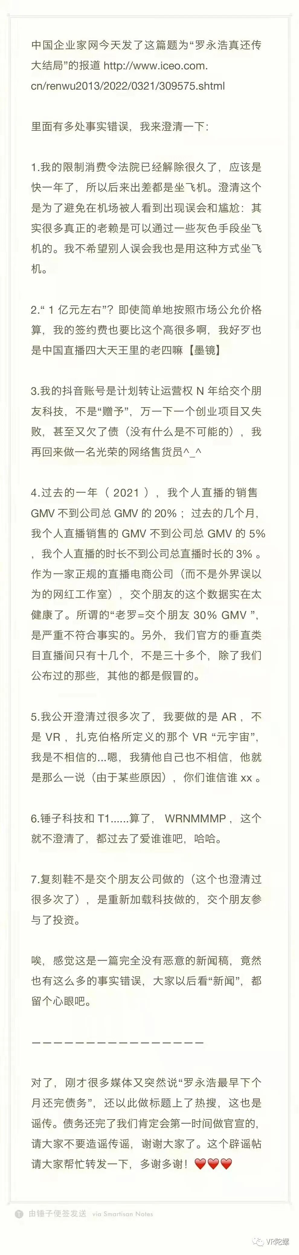 罗永浩微博发文,澄清《罗永浩“真还传”大结局》多处事实错误