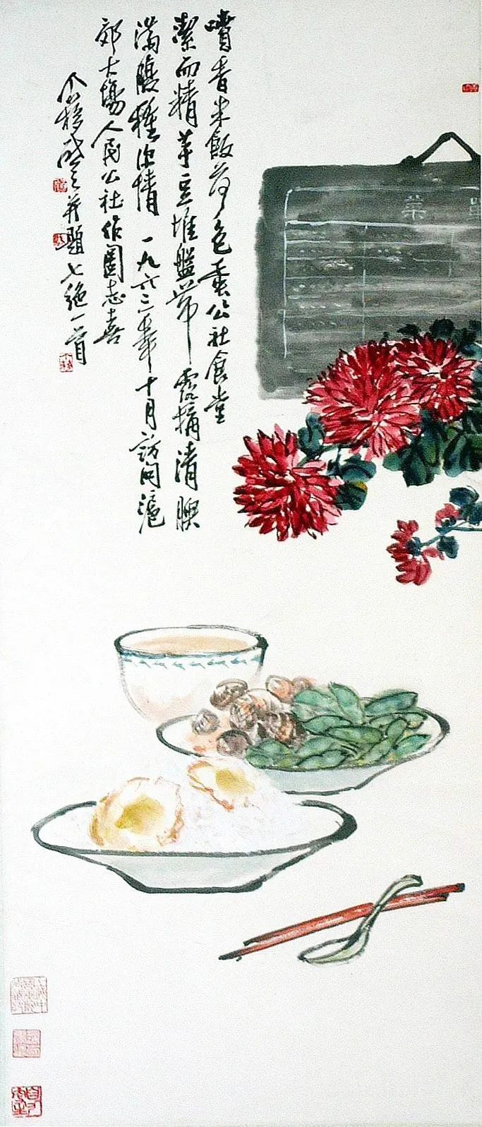 记得不久后我们去大场部队下生活,回来时路过一个公社,被请去参观、吃午饭,事后我怎么也忘不了午饭时吃的那几个又大又嫩的荷包蛋。于是就尽笔墨之能事画了下来,并配上一株霜菊以示时间。说句笑话,我想古往今来,以荷包蛋入画,大约是推我第一了。