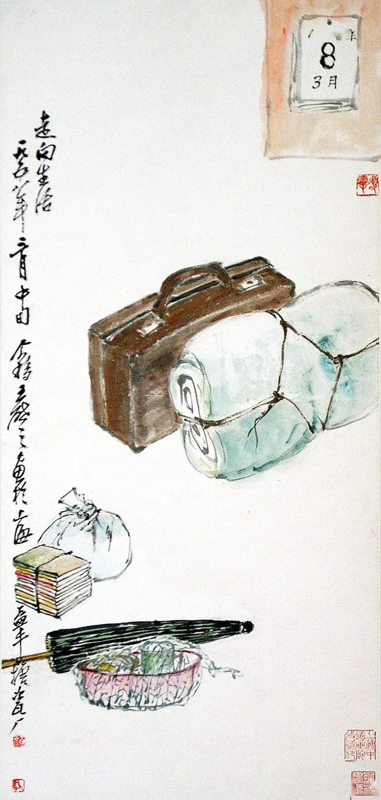 在厂里下生活时,我试图表现一些新题材。我把带到厂里去的油布伞、铺盖,一网兜的日用杂物搬上了画面,并画了一本日历,上面翻到三月八日——那是进厂的日子。画题是“走向生活”。依我之见,无物不能入画。只要你善于观察并发现所要描绘对象的美,并加以取舍和提炼,进行艺术加工,运用你所掌握的艺术技巧来反映它,就能达到预期的艺术效果。我以为,深入生活要以我为主,才能取舍、提炼和概括出生活中的美好形象,进行艺术再创造,也才能源于生活而高于生活。