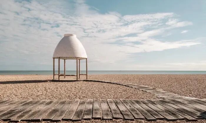 曾经是工业城市的福克斯通位于英国的肯特郡,肯特海岸坐拥丰富的旅游资源:海滩、白崖和丰富的历史建筑,但也面对着人口老龄化、产业转移、旅游资源过时的问题。而福克斯通三年展在这个背景下应运而生,三年展充分利用福克斯通的海洋景观和历史背景:从欣赏壮观日落的海岸到停泊船只的港口、废弃的煤厂,再到俯瞰海港的悬崖,通过户外艺术品和活动串联起自然环境和工业历史,试图在人与城市、海洋的互动中唤起游客思考周边环境的意识。