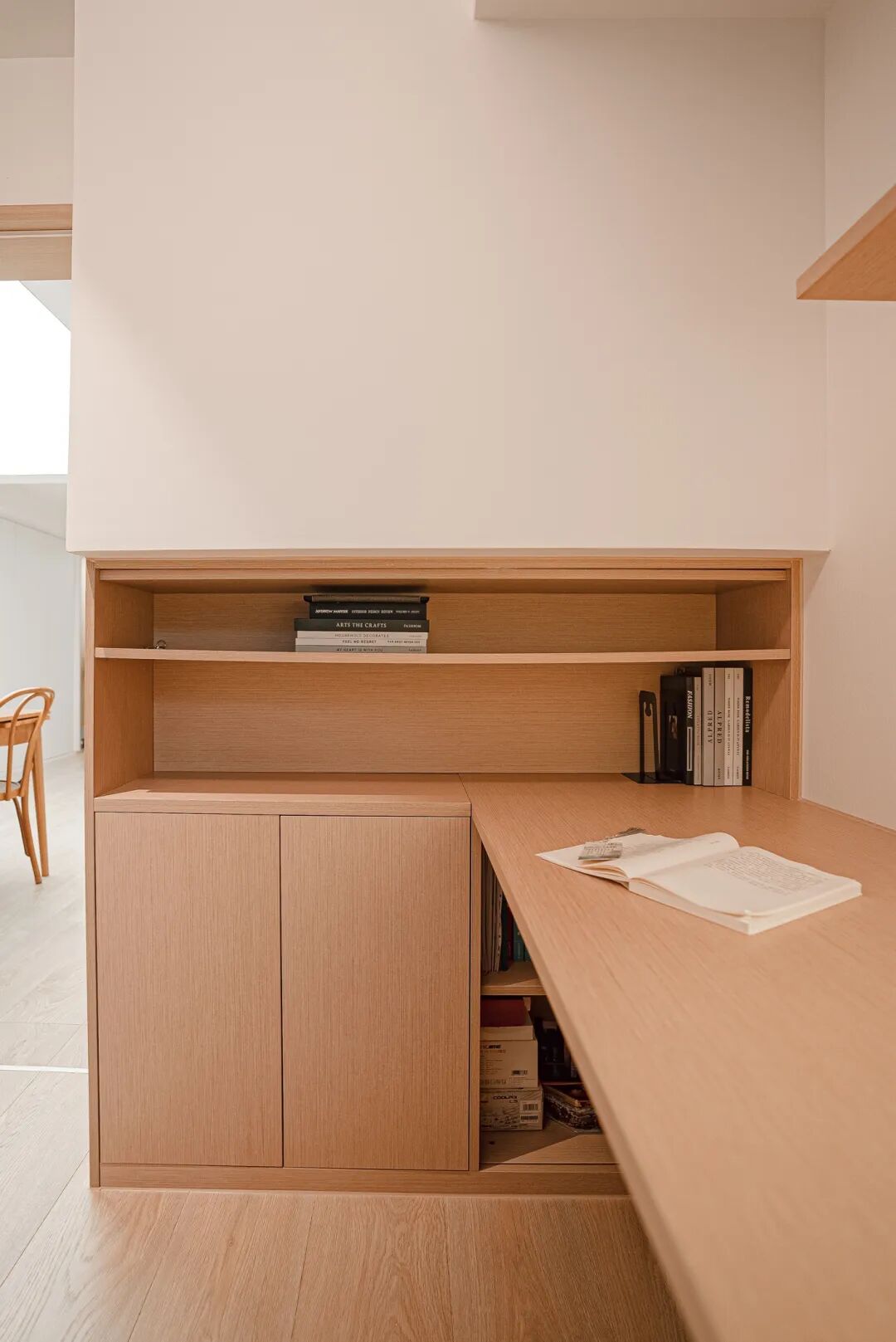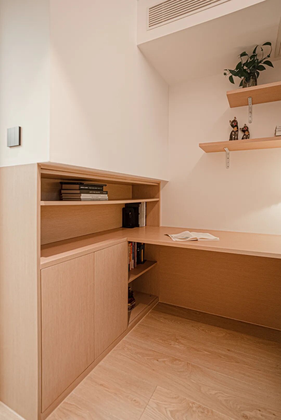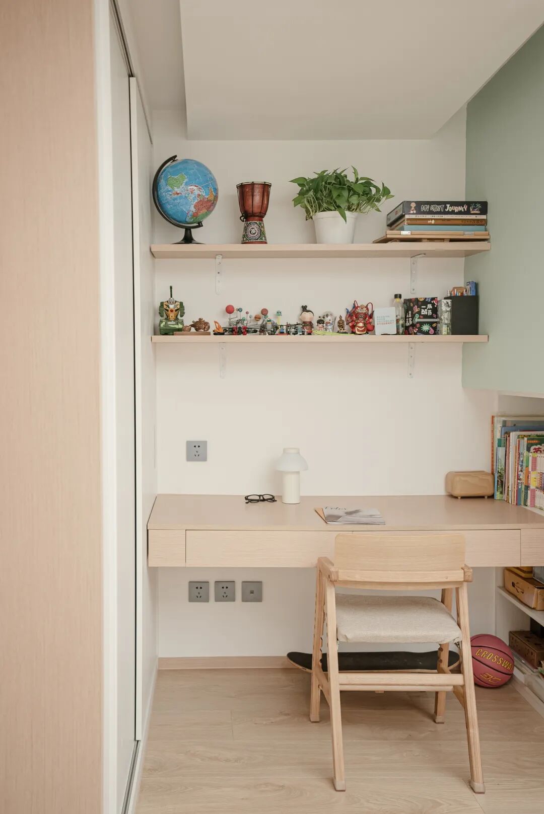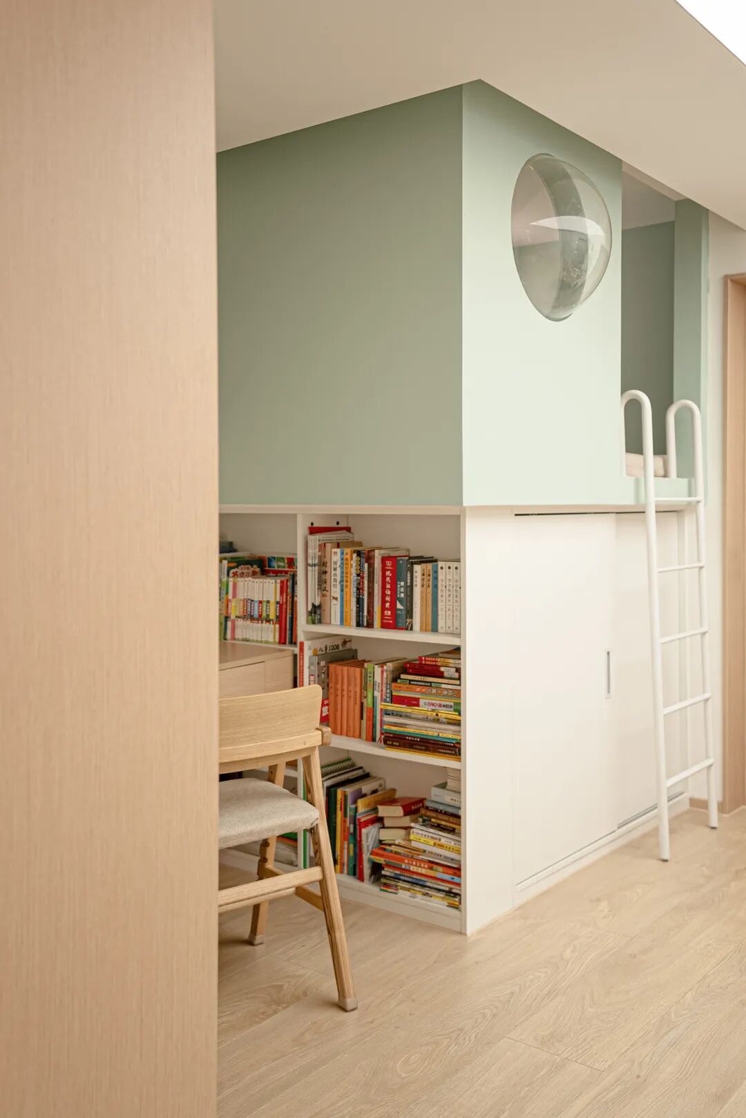 靠近书桌一侧还设置了高度合理的开放式书架,方便随手取拿,也有助于让小朋友养成自主收纳的好习惯。