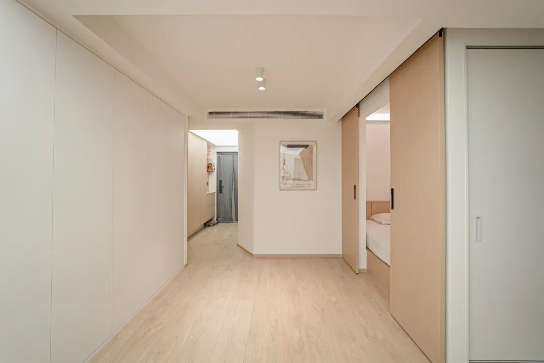 原户型是一个一室一厅,一进门是一个狭长的走廊,左手边是卫生间,视觉感受十分拥挤。