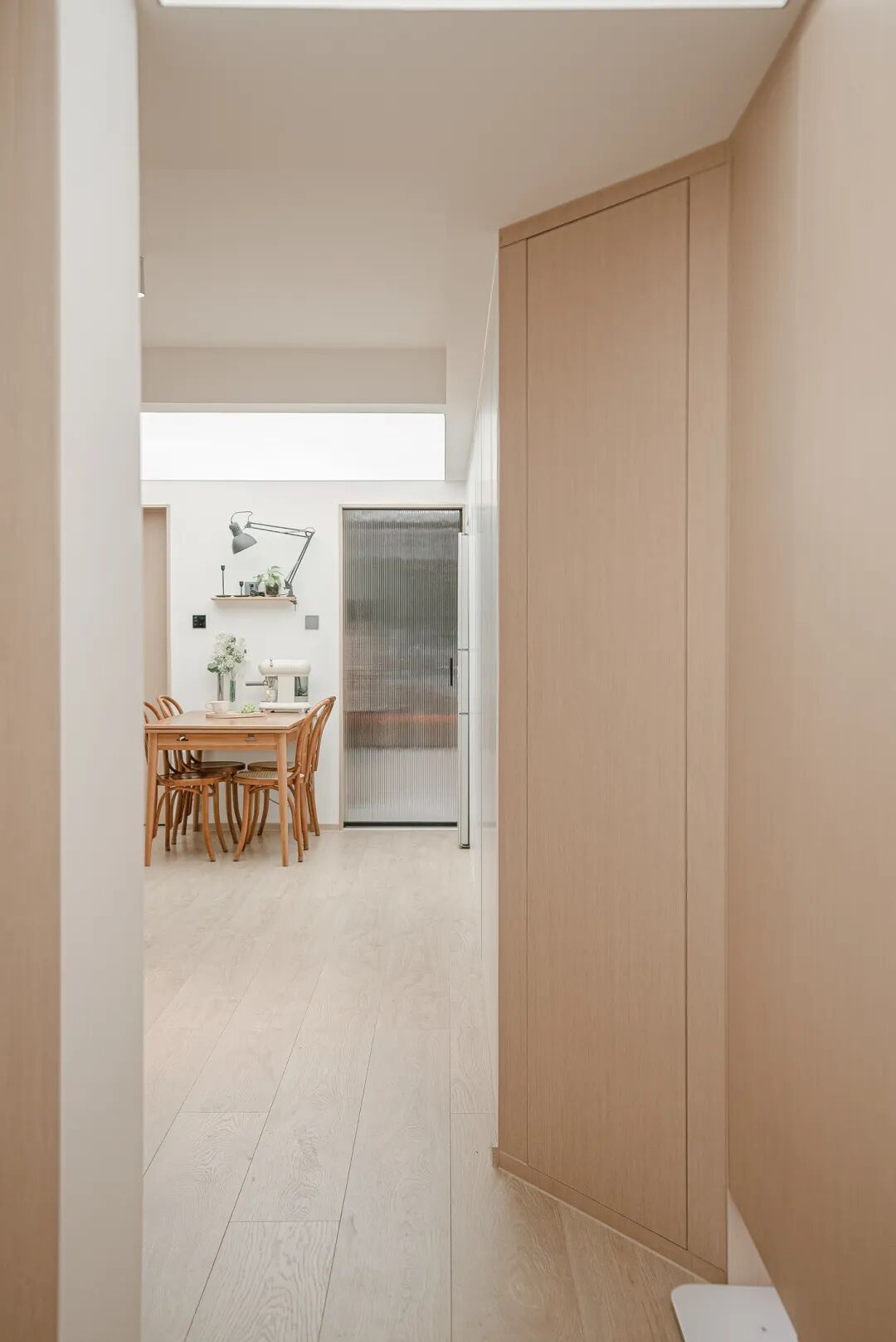 公共区域的收纳柜,从玄关一直延伸至餐厅厨房,柜体都采用了顶天立地的嵌入式设计+无把手的造型,拥有海量储物力的同时又十分隐形,无形中放大了空间。