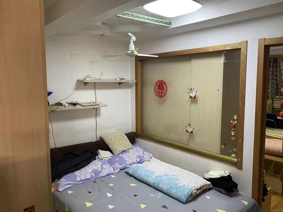 小朋友没有独立的儿童房,还和父母一起睡主卧,老人房也只是客厅里用柜子隔出来的一个空间,一家五口毫无隐私性可言。由于居住人口多、房子面积有很小,家里的功能空间也严重不足,杂物随处堆的满满当当。