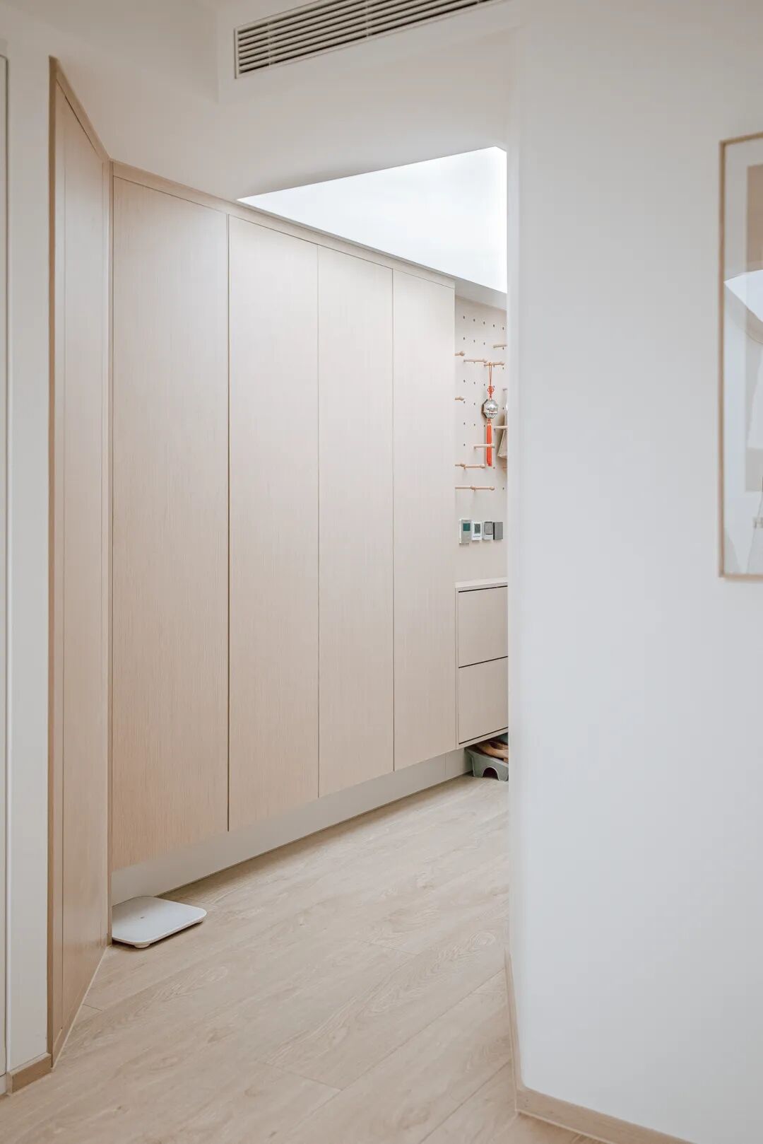 玄关用一整面收纳柜进行了精细化分区,超薄鞋柜+洞洞板悬挂区+斜角家政柜,让入户的收纳功能更丰富了。