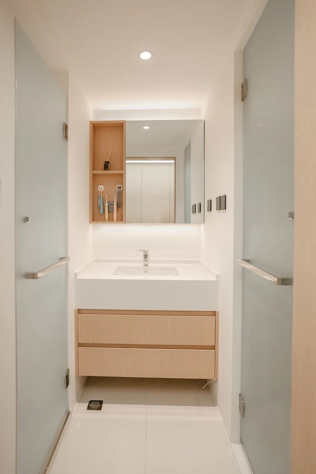 增加通透感的磨砂玻璃隔断、巧妙利用空间的收纳、木与白的自然温馨、柔和的漫反射光环境... ...每一处细节,都在努力为这个家提高更进一步的舒适感。